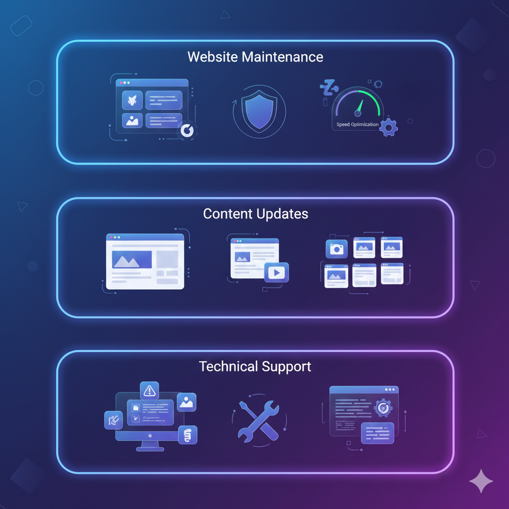 Technical Support: Bug fixes, plugin updates, and ongoing care so your site always works.