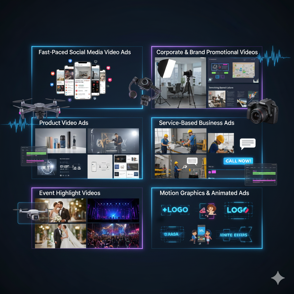 At AuraWave Designs, we create powerful video ads tailored for every need — from fast-paced social media ads optimized for Instagram, Facebook, YouTube Shorts, TikTok and Reels, to polished corporate and brand promotional videos that highlight your story, mission, and culture through interviews, workplace footage, and cinematic storytelling. We produce high-quality product video ads featuring close-ups, lifestyle shots, and explainer visuals ideal for Amazon, websites, and social media. For local service providers like installers, builders, electricians, home services and contractors, we craft impactful service-based business ads with on-site footage, before/after visuals, client testimonials, and strong CTAs. Our team also covers event highlight videos, capturing weddings, launches, and corporate events with cinematic editing and optional drone shots. To elevate brands further, we design motion graphics and animated ads — from logo animations to app promos, explainer animations, and dynamic text-driven visuals — ensuring every video communicates clearly and leaves a lasting impact.